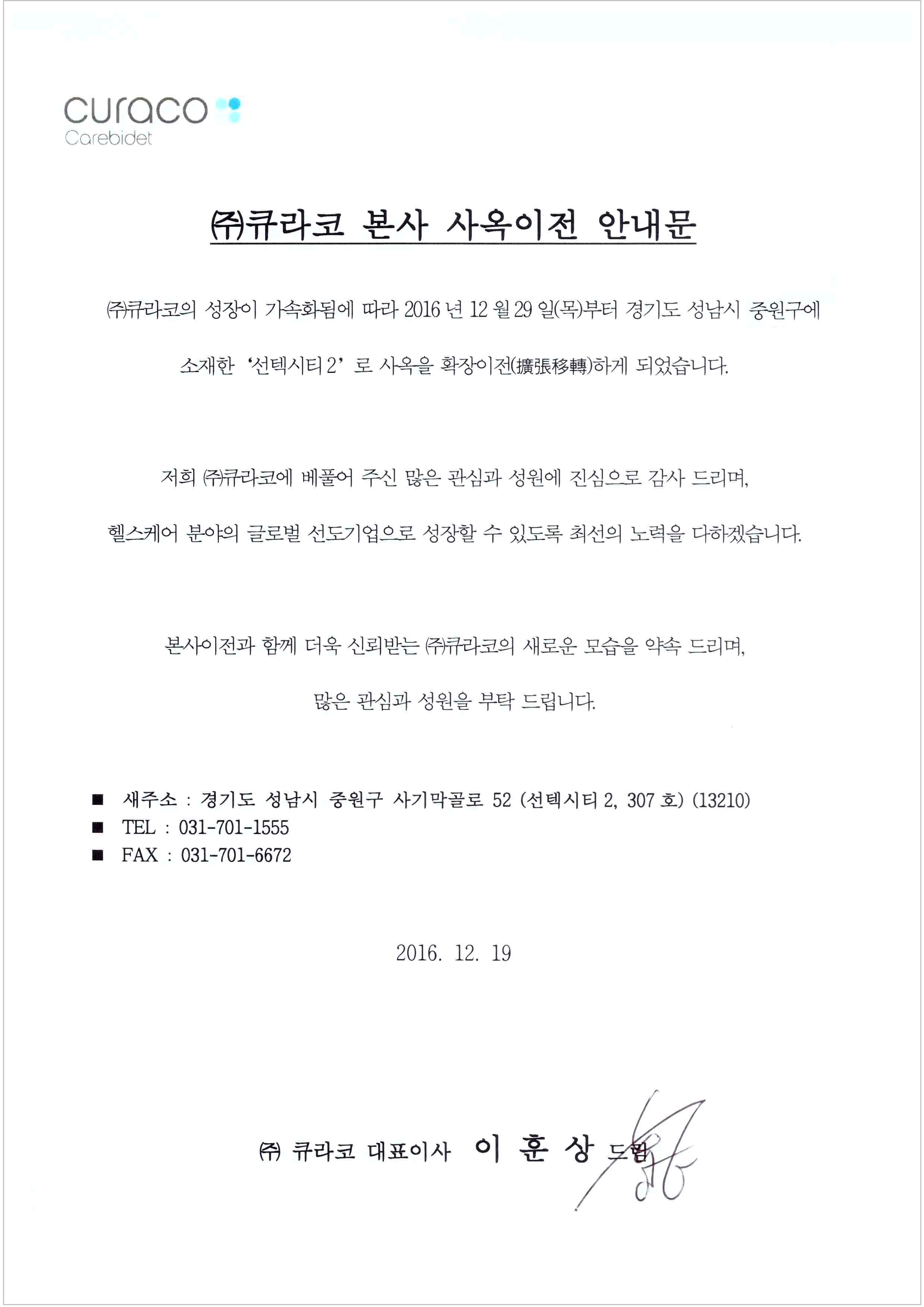 2016년 12월 21일 : (주)큐라코 본사 사옥이전 안내 페이지 정보 작성자 큐라코 댓글 0건 조회 516회 작성일21-10-28 11:14 본문 (주) 큐라코 본사 사옥이전 안내문 (일시: 2016년 12월 29일 목요일): 사옥이전 안내문 보기 목록