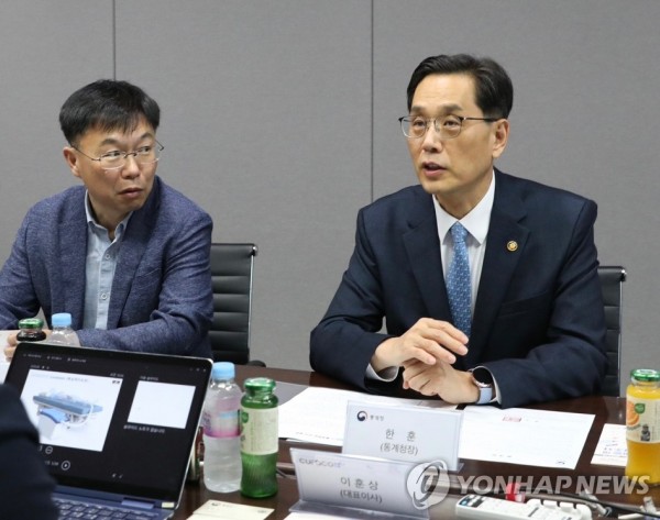 (서울=연합뉴스) 한훈 통계청장(오른쪽)이 13일 경기도 성남 헬스케어혁신파크에 위치한 (주)큐라코를 방문, '2023년 경제통계 통합조사' 협조를 당부하고 있다. 2023.6.13 [통계청 제공. 재판매 및 DB 금지]