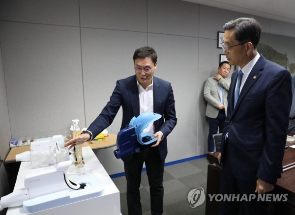 (서울=연합뉴스) 한훈 통계청장(오른쪽)이 13일 '2023년 경제통계 통합조사' 대상 업체인 경기도 성남 (주)큐라코를 방문해 간병용 케어로봇 제품 시연을 참관하고 있다. 2023.6.13 [통계청 제공. 재판매 및 DB 금지]
