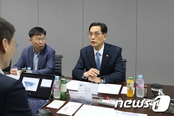 한훈 통계청장(오른쪽 첫 번째)이 13일 경기도 성남 헬스케어혁신파크에 위치한 큐라코를 방문, ‘2023년 경제통계 통합조사’ 협조를 당부하고 있다. (통계청 제공) 2023.6.13/뉴스1