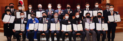 매일경제신문과 산업통상자원부 주최로 서울 중구 매경미디어센터에서 제19회 대한민국 신성장 경영대상 시상식이 열렸다. 앞줄 왼쪽부터 이훈상 큐라코 대표, 윤소현 알티스트 대표, 최명진 한컴인스페이스 대표, 안재용